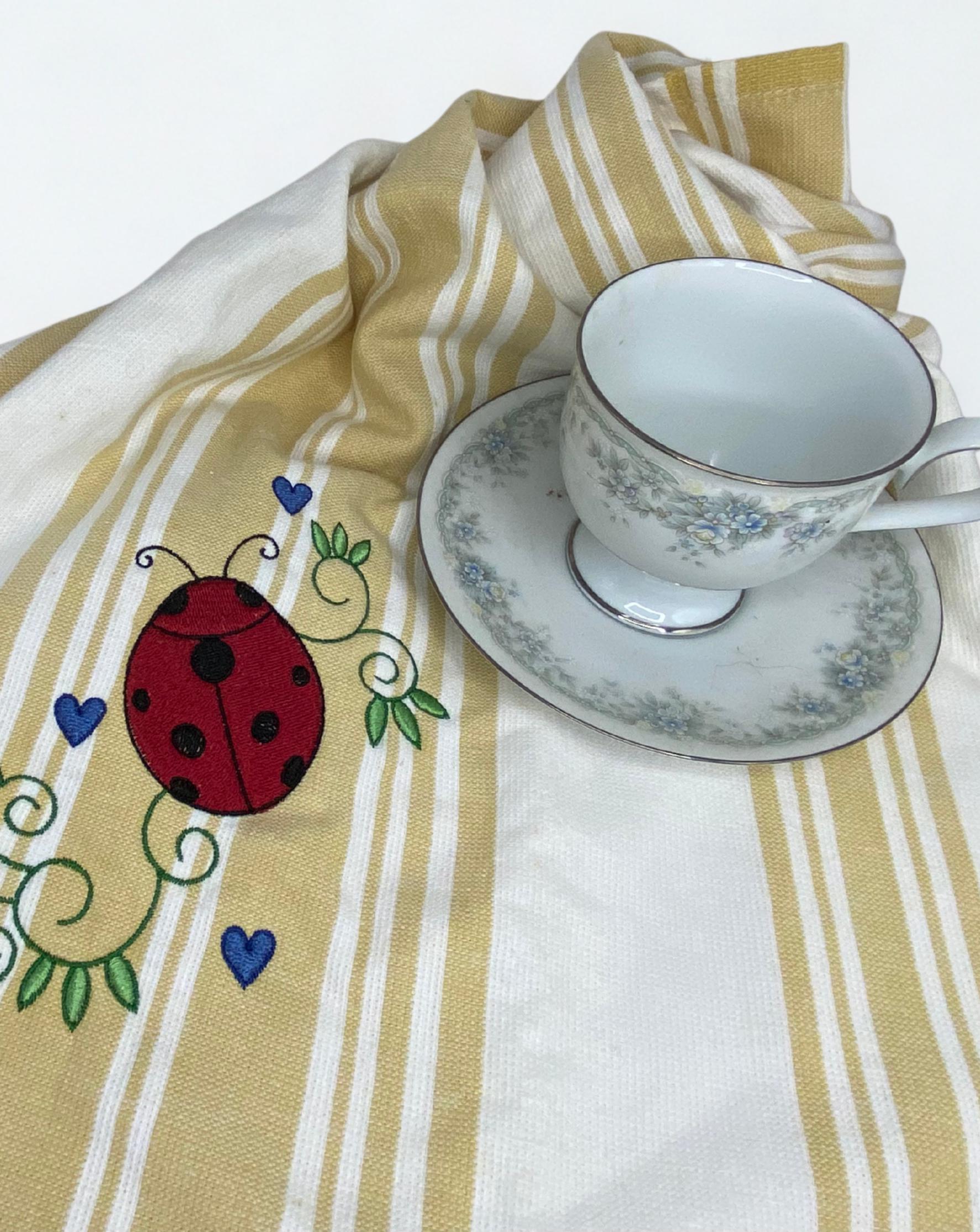 $22 Ladybug Swirl on Oversized, Wide Yellow Striped Dish Towel (19" x 29") – Easy Care Cotton